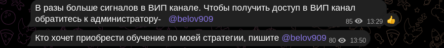 Сразу после вышеупомянутой публикации инвестиционный трейдер Николай Белов предлагает подписаться на платный телеграм-канал. Помимо VIP-сообщества, владелец паблика делает оффер на покупку обучения по стратегии.