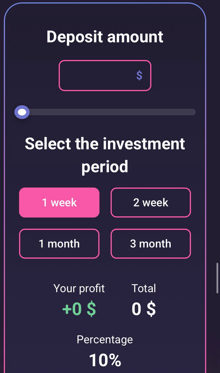 Примечательно, что принимаются для стейкинга только доллары. Минимальная сумма – 1 доллар, максимальная 10 000. Предусмотрено три варианта размещения – на неделю под 10%, на 2 – под 25%, размещение средств на месяц принесет 70% прибыли от депозита, а на 3 месяца целых 250%. Примечательно, что гарантий получения прибыли нет.Для начала сотрудничества следует пройти регистрацию на сайте. Она подразумевает указание личных данных и согласие с условиями пользовательского соглашения.
