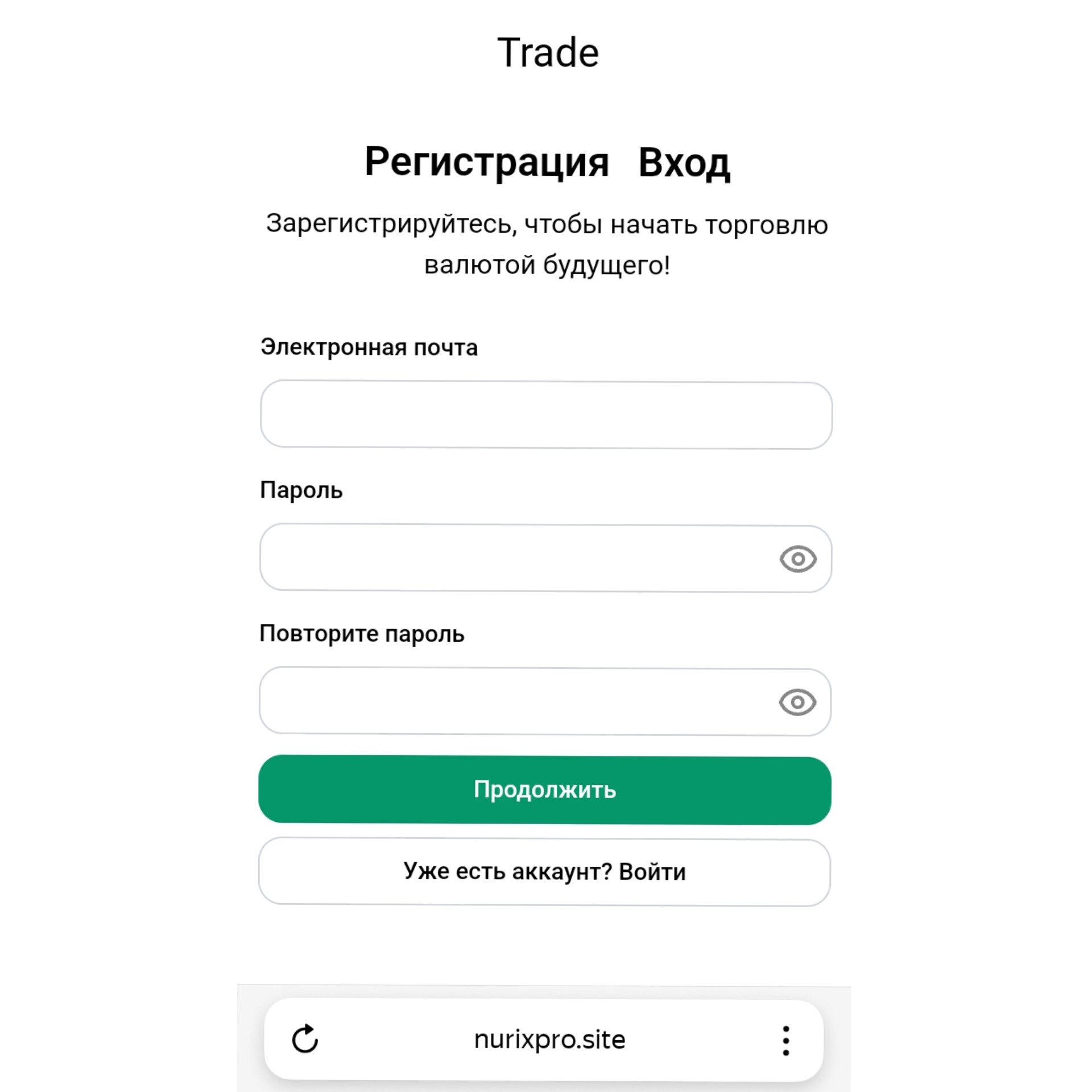 Проект работает через веб-ресурс nurixpro site. Он предоставлен на русском языке, а функции для смены языка нет. Сайт односторонний, и здесь можно только пройти регистрацию или же создать учетную запись. Стоит отметить, что в сети есть множество идентичных по оформлению бирж.