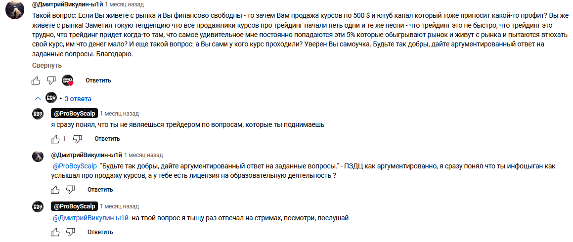 На попытки задать вопросы о деятельности самого Proboy, успешности и наличия лицензии, подписчики получают агрессивную реакцию. Для профессионального трейдера такие ответы нехарактерны, что вызывает множество вопросов о компетенции.