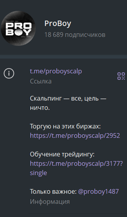 Телеграм проект Proboy Scalp предлагает заработок на скальпинге. Автор ресурса делится собственными наблюдениями, опытом торговли, обсуждает перспективность различных токенов. Канал был открыт в 2023 году, одновременно с ним начал деятельность Ютуб проект. На площадках автор выкладывает прогнозы, личные размышления о криптотрейдинге, публикует статистику.