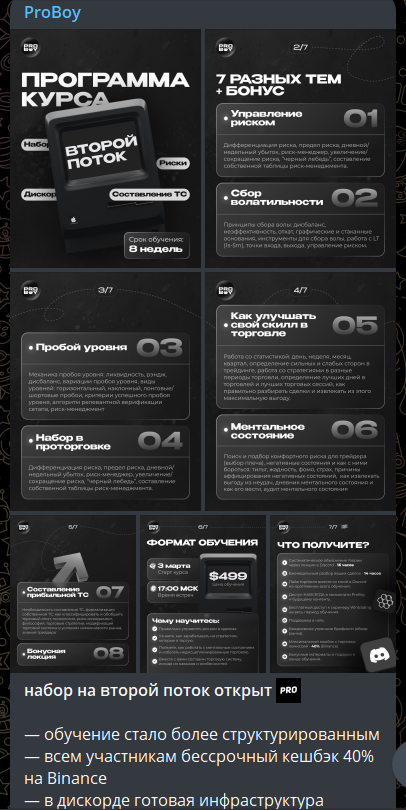 Обучающий курс от Proboy Scalp ориентирован на новичков и тех, кто уже имеет определенный опыт криптотрейдинга. Слушателям предлагается понять, как работать с рисками, выбирать стратегию и начать успешно торговать. Часть урока посвящена теории (примерно 16 часов), разбору сделок, лайв записей. Даны краткие описания рынка с пояснениями, предусмотрен бонусный материал.