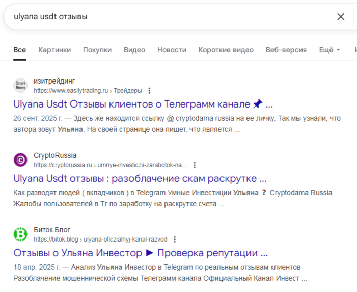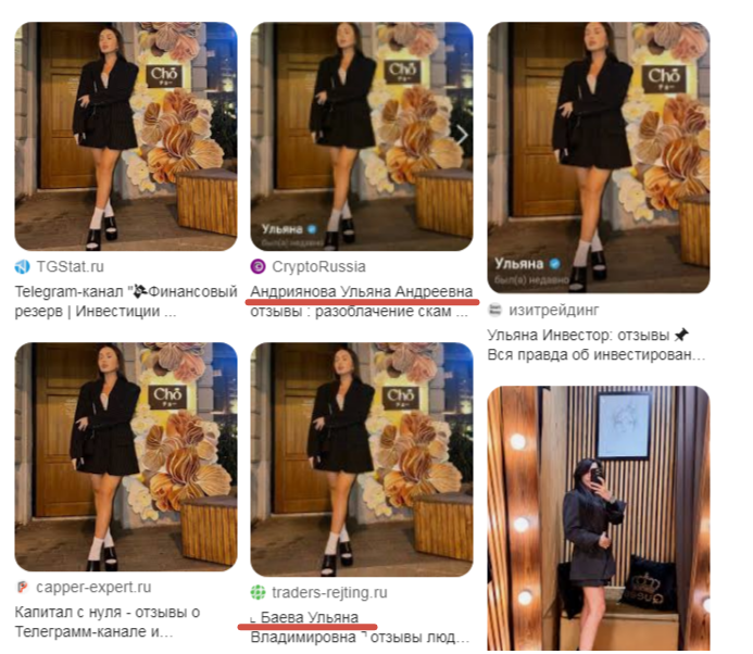 Сделав поиск по аватарке оказалось, что где-то девушка Ulyana Usdt подавляется как Андриянова Ульяна Андреевна, а где-то – Баева Ульяна Владимировна. Это намекает на то, что она придумывает себе новые имена с чистой репутацией и пытается скрываться от обманутых клиентов.