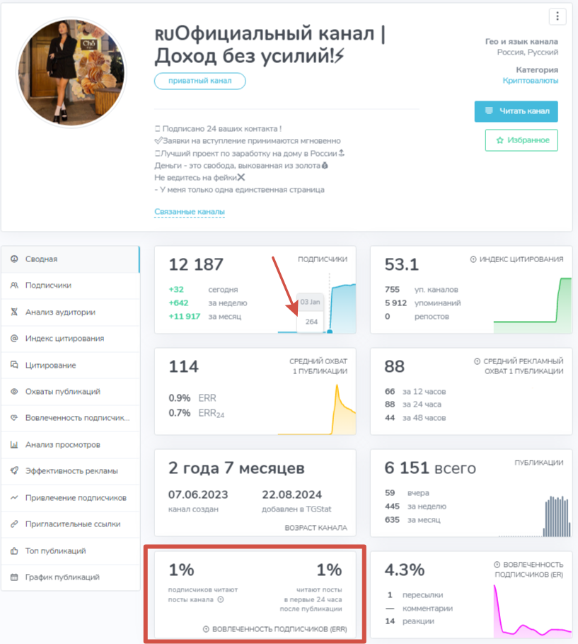 В самом паблике нет активности от аудитории, хотя он имеет 12 тысяч подписчиков. На статистике канала видно, что тут был резкий рост аудитории, а контент читает всего 1% пользователей. 3 января здесь находилось всего 264 подписчика, а на следующий день их стало уже 11 300. Это говорит о том, что админ накрутил в группу ботов, и тут нет настоящих зрителей.