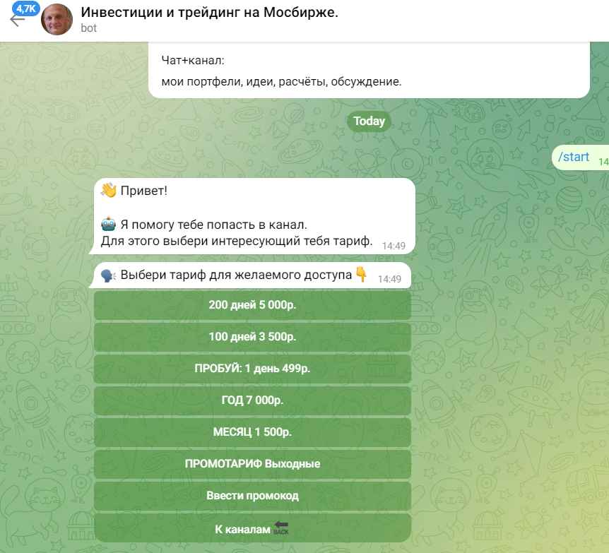 Оформить подписку можно прямо через бота. Второй способ приобрести доступ к чату — перевести деньги на банковскую карту инвестора и написать ему в личные сообщения. Реквизиты админа оставлены под публикациями. Автор уверяет в честном сотрудничестве и качественном контенте.