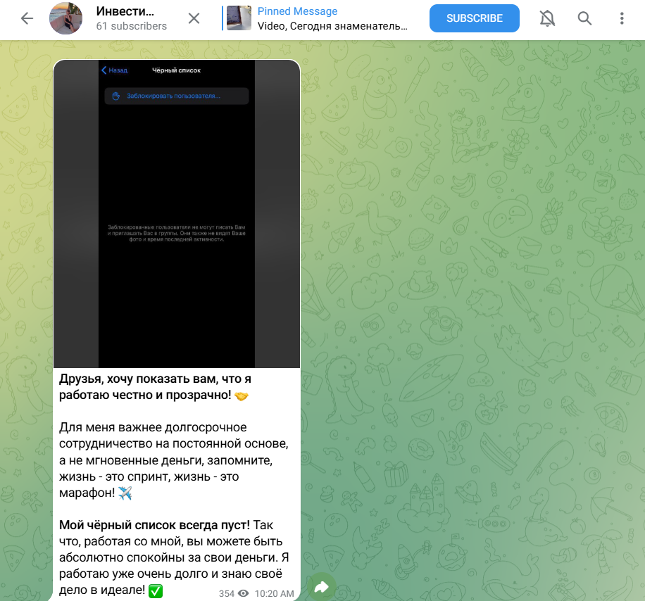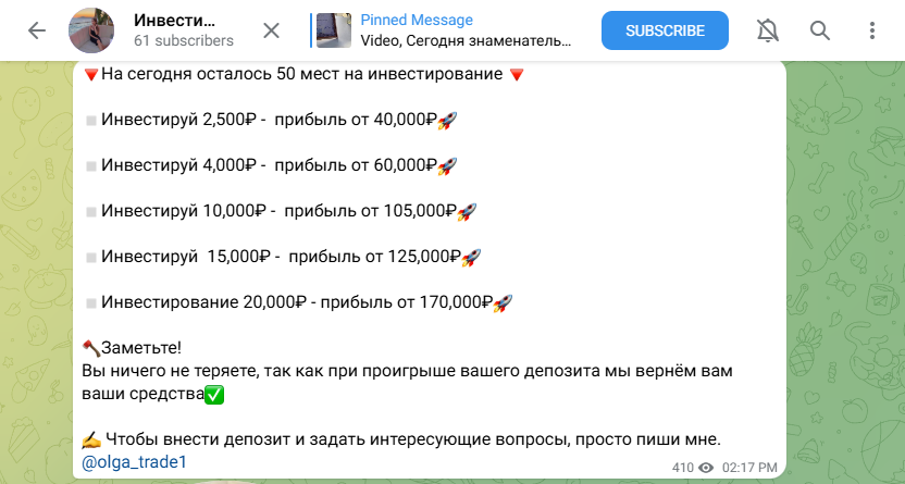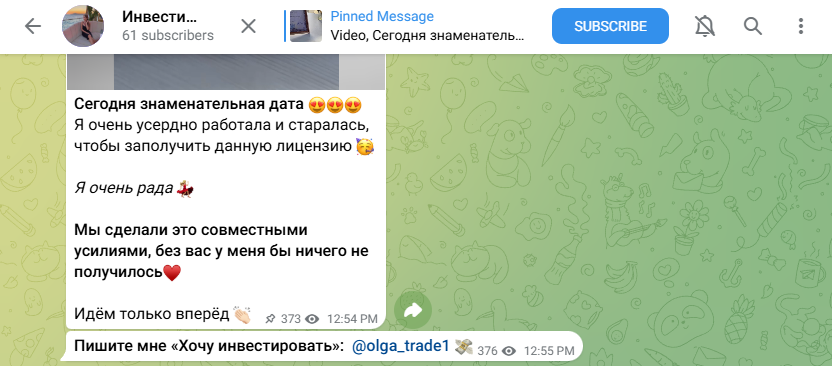 Чтобы поднять уровень доверия среди своей аудитории, Invest Olya1 публикует отзывы якобы счастливых клиентов, однако из-за закрытых комментариев и реакций в чате — связаться с этими людьми невозможно.