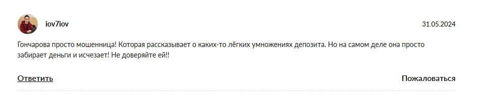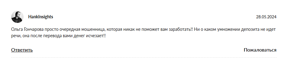 • негативные отзывы об инвестициях с Ольгой Гончаровой.