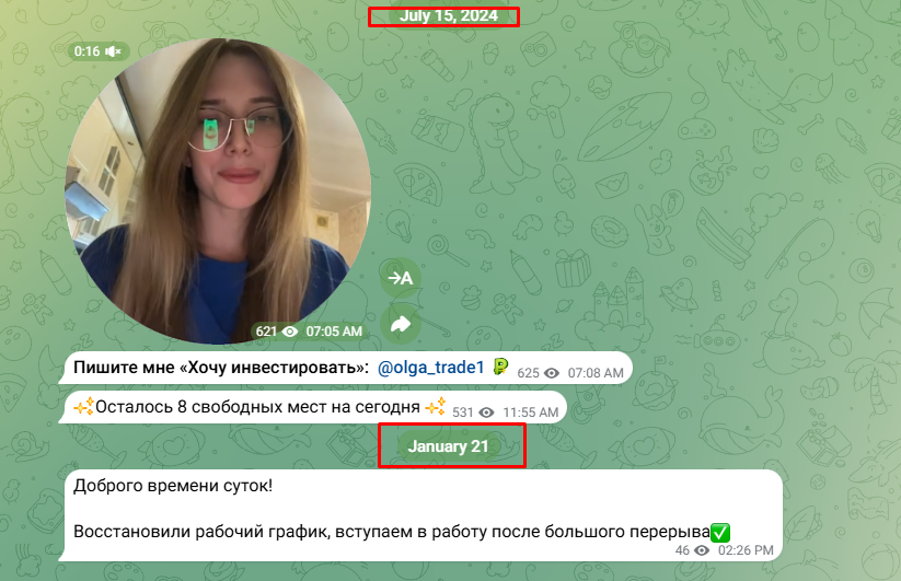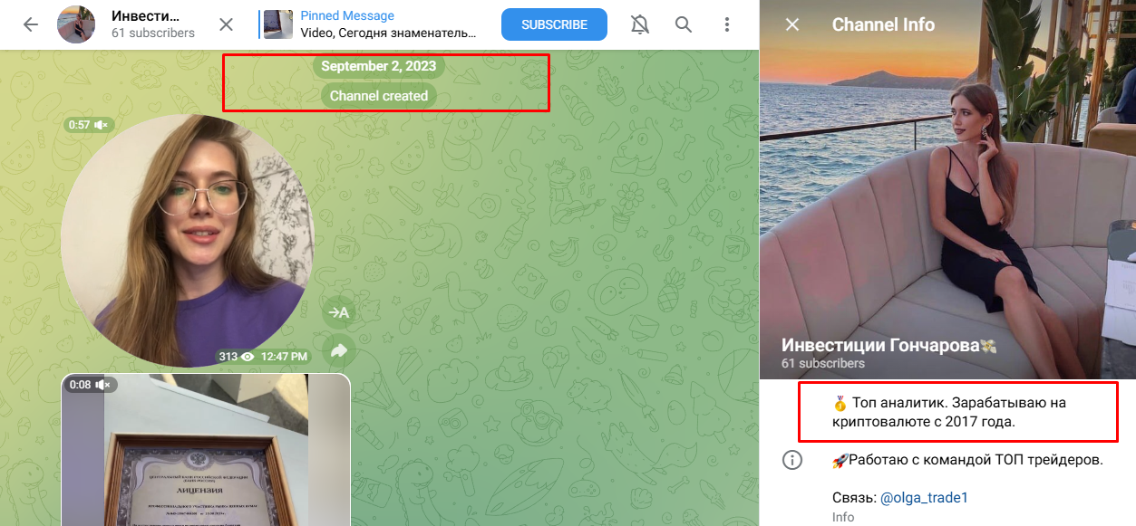 Инвестор Ольга Гончарова начала свое развитие в 2023 году, когда был создан блог в телеграм под названием “Инвестиции с Гончаровой”. Она предоставляла себя как опытного трейдера и специалиста по криптовалюте, которая зарабатывает в этой сфере с 2017 года, однако в сети отсутствовала информация об Invest Olya1, что могло говорить о скаме с ее стороны.