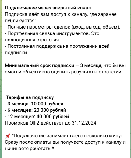Еще одно направление деятельности – продажа доступа в закрытый канал. В данном канале участники получают торговые сигналы в виде заранее обозначенных параметров сделок. Клиентам дается полный портфель инструментов, то есть готовая стратегия, по которой подписчик собирает свой инвестиционный портфель. Дополнительно пользователю оказывается поддержка на протяжении всего периода подписки.