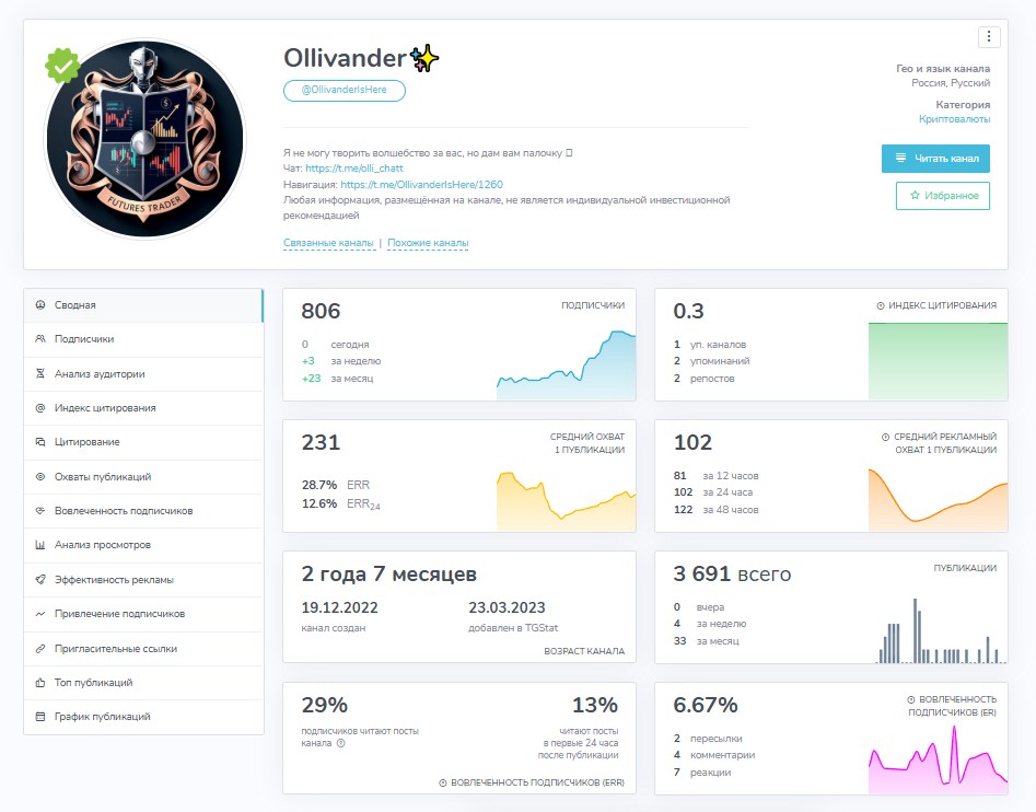 Телеграм-канал Ollivander создан 2 года 7 месяцев назад. За этот период в сообществе собралось всего 804 подписчика. Аудитория небольшая и не отличается особой активностью. Посты просматривает максимум 250 человек, реакций под публикациями очень мало. Возможность комментировать посты есть, но пользователи ей практически не пользуются.