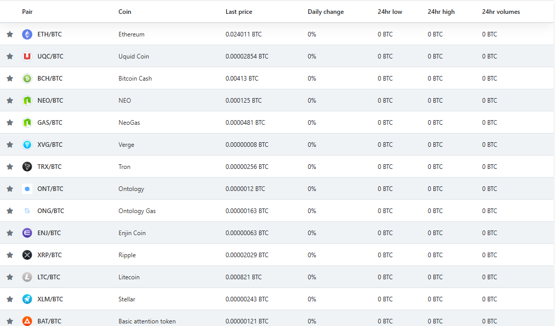 На площадке Omgfin com доступна торговля примерно 40 криптовалютными активами. В их числе BTC, ETH, XRP, TRX, NEO, GAS, XLM, LTC. Большой выбор вариантов — преимущество торговой платформы.