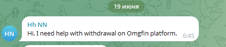 Со своими вопросами клиенты могут обратиться в телеграм-канал Omgfinofficial. Однако поддержка работает плохо. Например, пользователь написал 19 июня 2025, что ему нужна помощь, даже на следующий день ему никто так и не ответил.