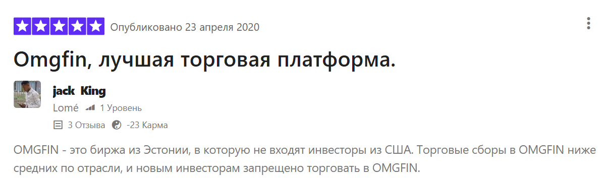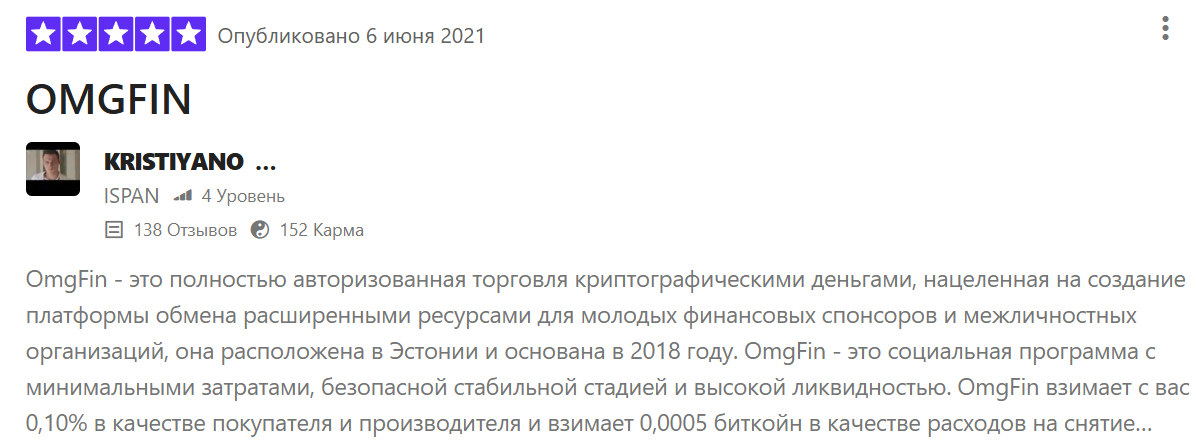 Отзывы про Omgfin в целом положительные. Один из клиентов хвалит платформу за минимальные комиссии, высокую ликвидность и безопасность.