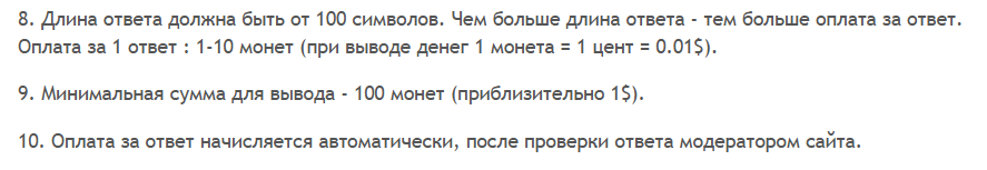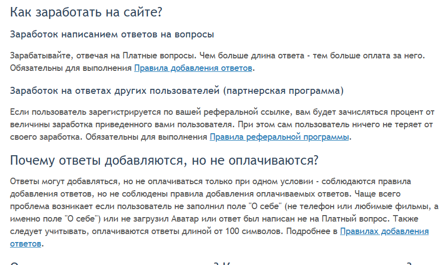 Владельцы проекта утверждают, что на сайте только полезные ответы, потому что всякий мусор система отсекает, причем можно не просто помогать кому-то, но и получать за это деньги. Чтобы начислялась оплата, нужно придерживаться ряда условий, например, заполнить информацию о себе, установить аватарку и писать ответы более 100 символов.