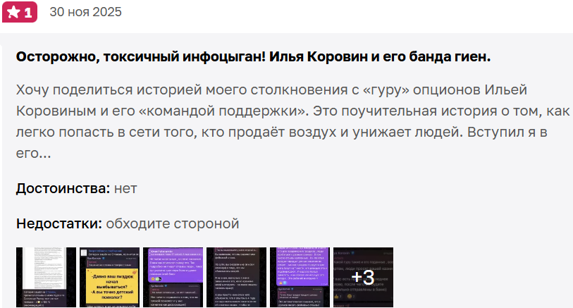 При этом нет подтверждений, что сам ilyakorovin способен делать прибыль на дистанции на американских опционах. Он не публикует статистику своих сделок, не проводит живые торговые сессии. Ничто не говорит о том, что у него есть хоть какие-то доходы, кроме заработков на продаже инфопродуктов.