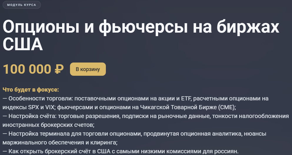 Клиента Коровин обещает научить открывать брокерские счета в США с самыми низкими комиссиями, рассказать об особенностях опционов на американских биржах, научить настраивать терминал. Он предупреждает, что курс рассчитан не на новичков, подойдет только тем, кто уже умеет работать с опционами на российском рынке.