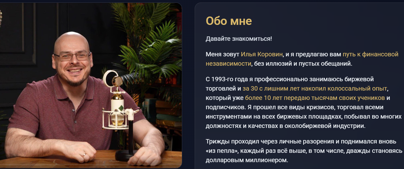 Обучение по торговле производными инструментами на американском рынке трейдер Илья Коровин предлагает с 2023 года. Он называет себя успешным спекулянтом, способным зарабатывать на всех видах популярных активов и занимается обучением по всем направлениям.
