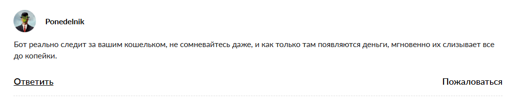Отзывов о боте «Опустошителе» мало, но все они создают плохую репутацию проекту. Люди пишут, что площадка для трейдинга ворует деньги с кошелька.
