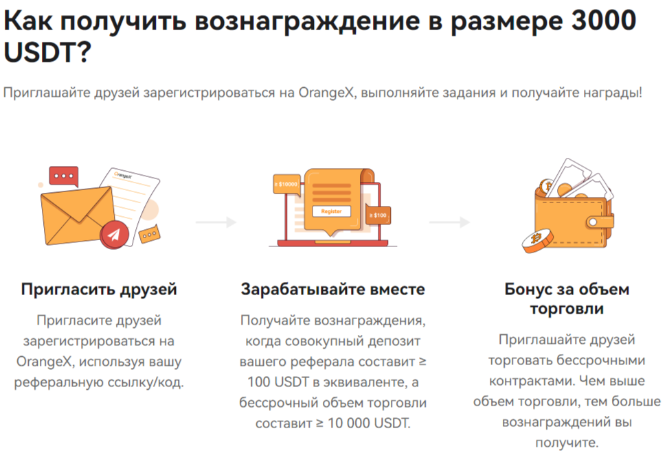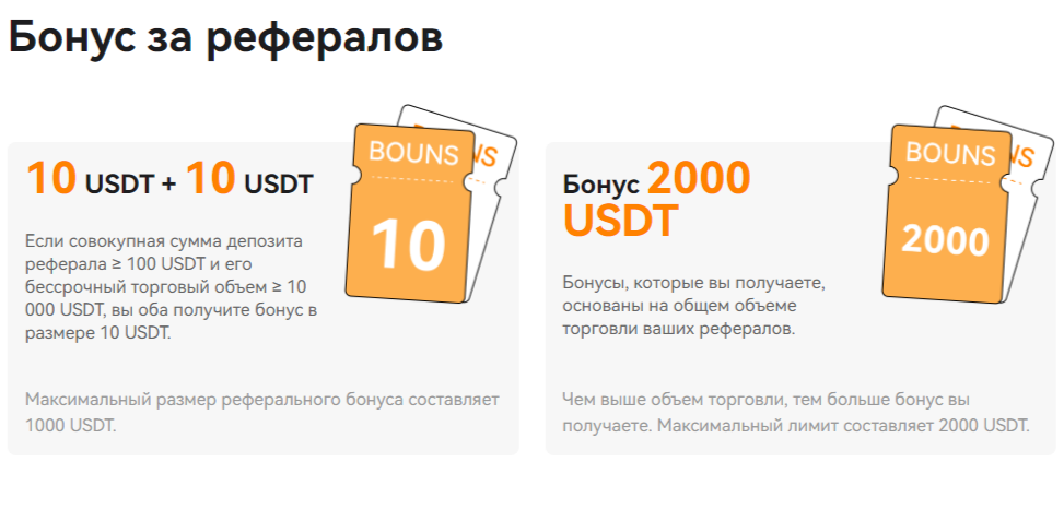 После того, как суммарный депозит партнера составит более 100 USDT в эквиваленте, а бессрочный объем торговли будет более ≥ 10 000 USDT, тогда приглашающему будет отправлено вознаграждение. Чем больше объем торговли рефералов, тем выше бонус может ожидать трейдер.