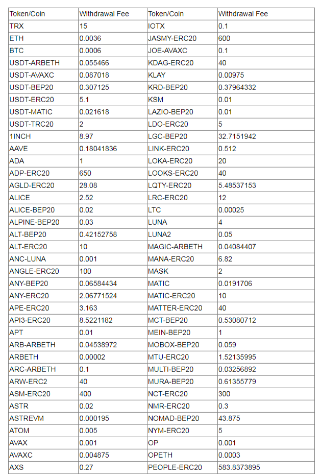 Во вкладке сборы представлена таблица с наименованиями более 200 монет/токенов и комиссией за ее снятие.