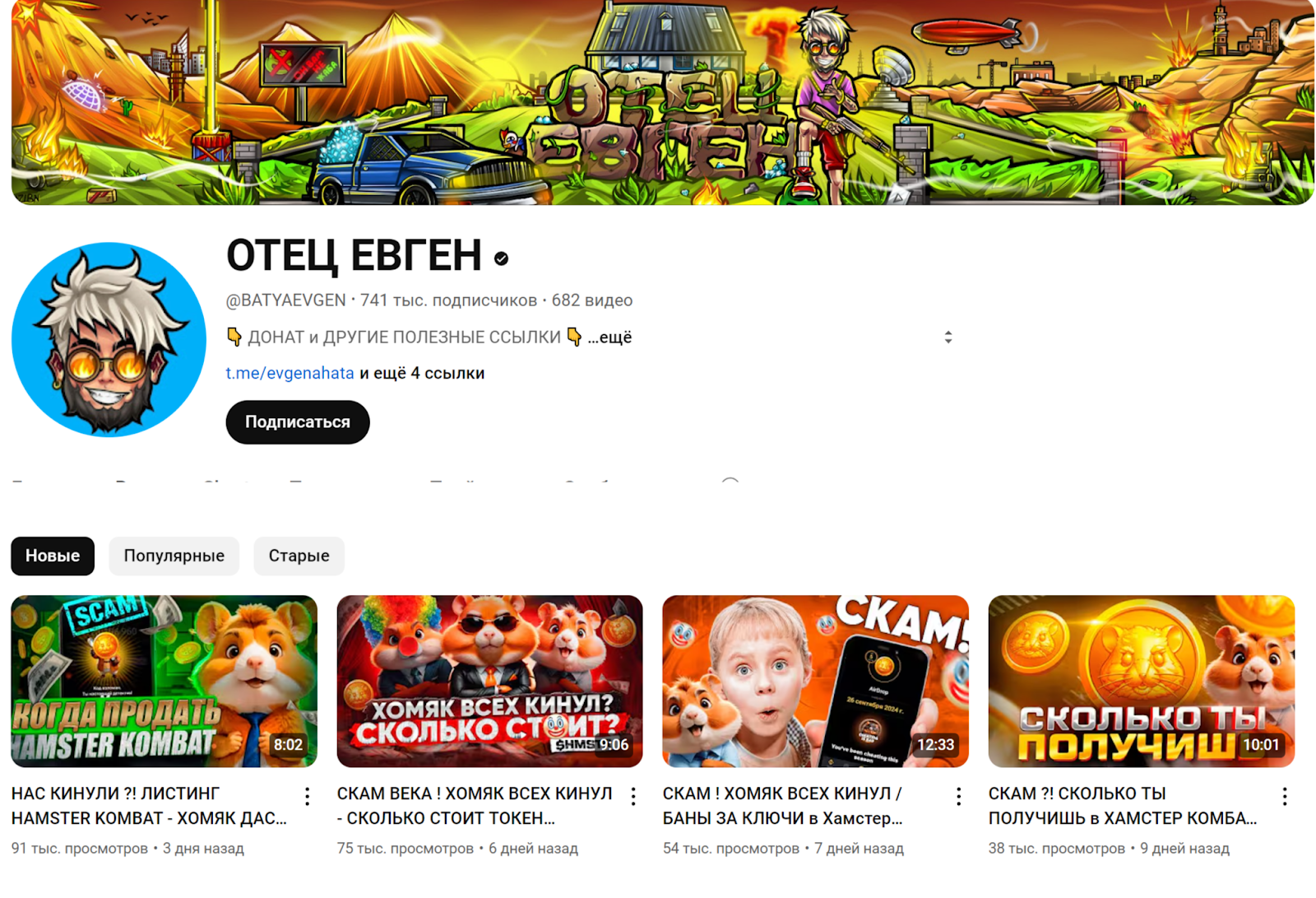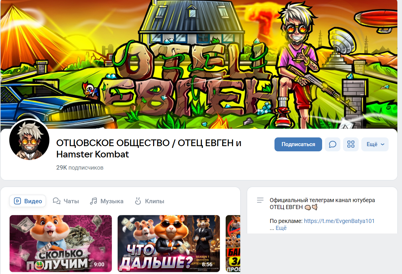 Частота размещения роликов на Batyaevgen — 1 в 2-3 дня. Они имеют продолжительность от 5 до 15 минут и посвящены определенным криптопроектам. Автор лично рассказывает о вариантах получения заработка и дает советы новичкам. Наибольшее внимание последнее время уделяется Хамстер Комбат и его развитию.Также у трейдера имеется группа в ВК — Отцовское сообщество / Отец Евген и Hamster Kombat. Уже по названию понятно, что главное внимание здесь уделяется основной кликалке и ее развитию. За время работы инвестор сумел собрат аудиторию в 29 тыс. человек, но по факту записи смотрит не больше 1000 фолловеров.