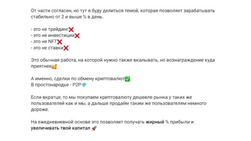 Более того, Yatutvlad предлагает услугу раскрутки на P2P-связках, заявляя, что его клиенты получают 2% к депозиту ежедневно. Однако эта информация является фейком, если бы трейдер действительно мог зарабатывать такие суммы, ему бы не требовались клиенты.