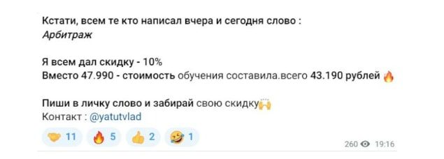 Трейдер заявляет, что предлагает высококачественную обучающую программу, оцениваемую на рынке в 200 тысяч рублей, но своим подписчикам он готов отдать ее за 43 190 рублей. Для привлечения пользователей иногда проводится распродажа, и цена на курс снижается еще на 20%. Таким образом, продается обычный информационный слив.