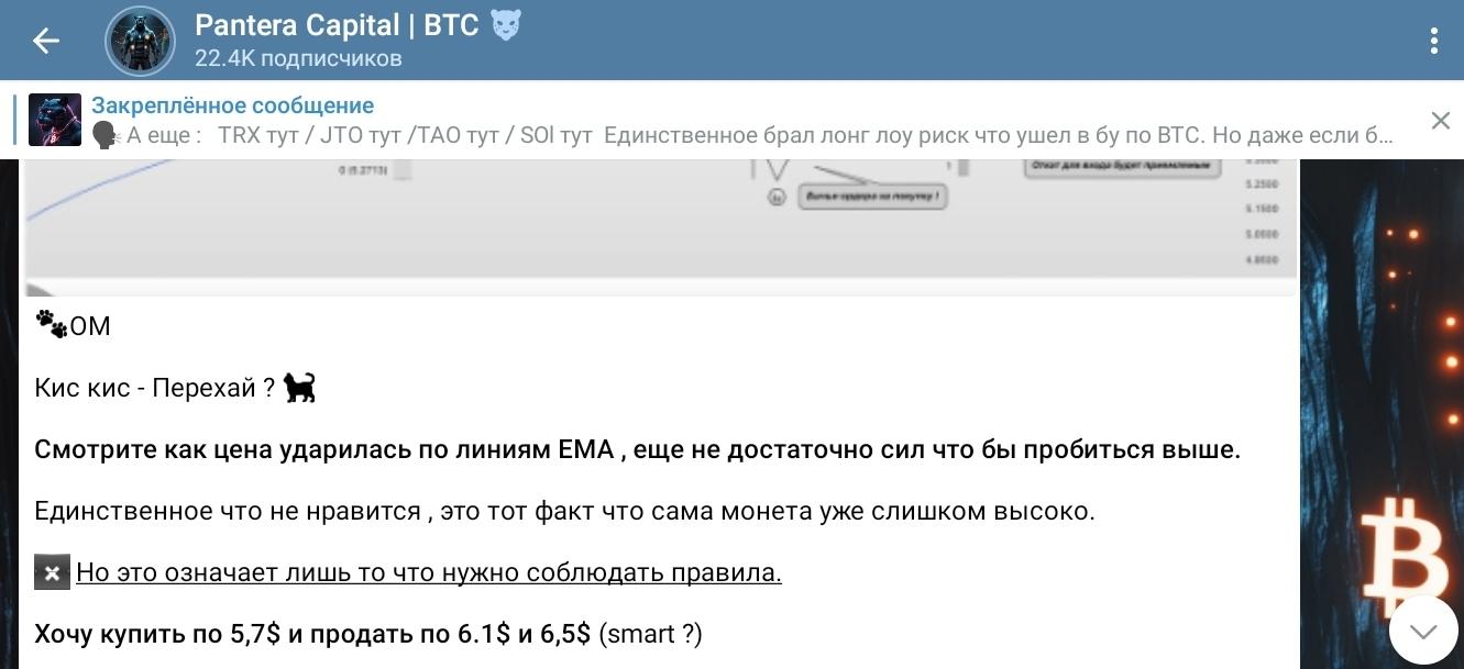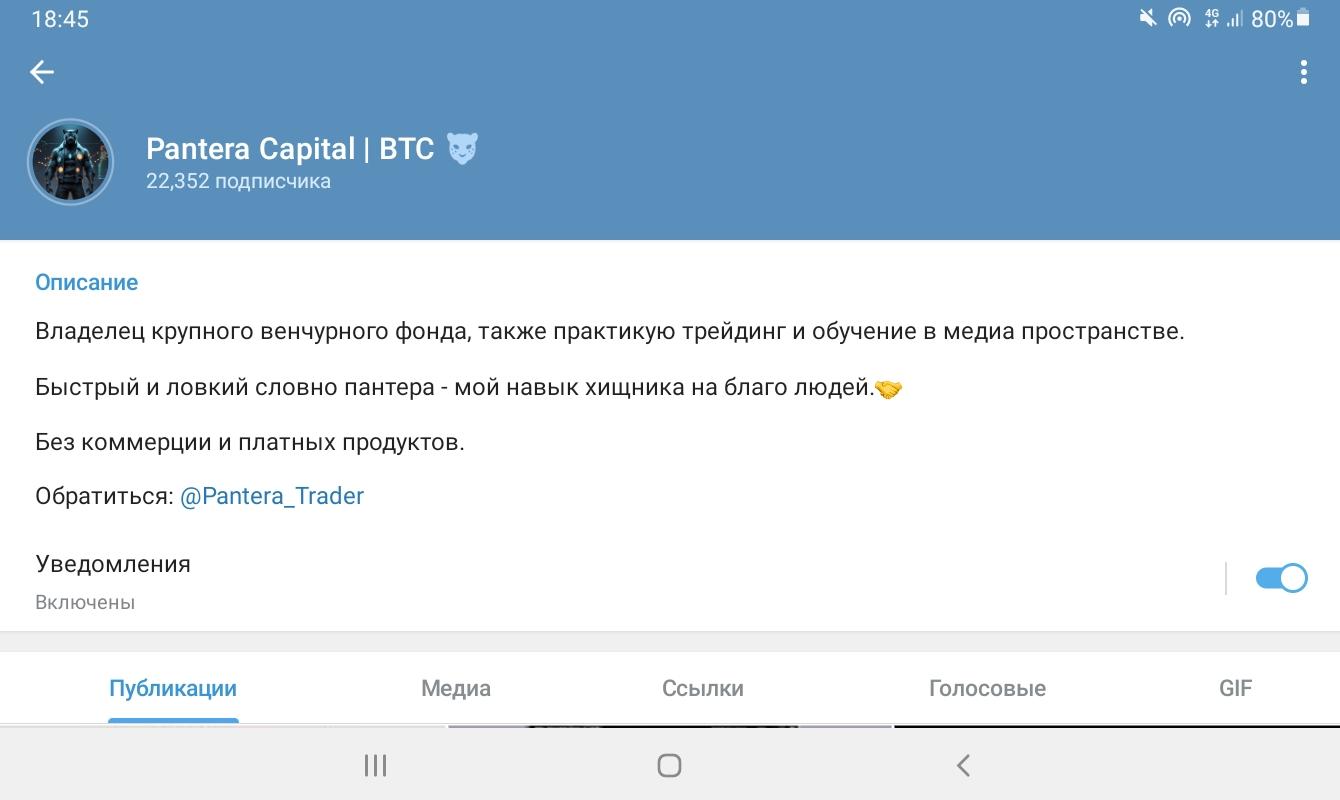 - О владельце канала в Телеграмме Pantera Capital ничего неизвестно, он утверждает, что владеет крупным венчурным фондом и зарабатывает на трейдинге 10 000 долларов в месяц, но подтверждений не дает, а это вызывает сомнения в прозрачности сотрудничества;