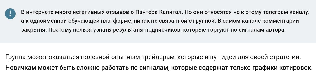 Если попытаться поискать отзывы о «Пантера Капитал», в результатах будет не канал трейдера, а обучающая платформа. Об авторе мнений в сети нет. Так как комментарии отключены, узнать точку зрения участников тоже нельзя. Канал существует почти 3 года, поэтому странно, что о нем никто ничего не пишет.