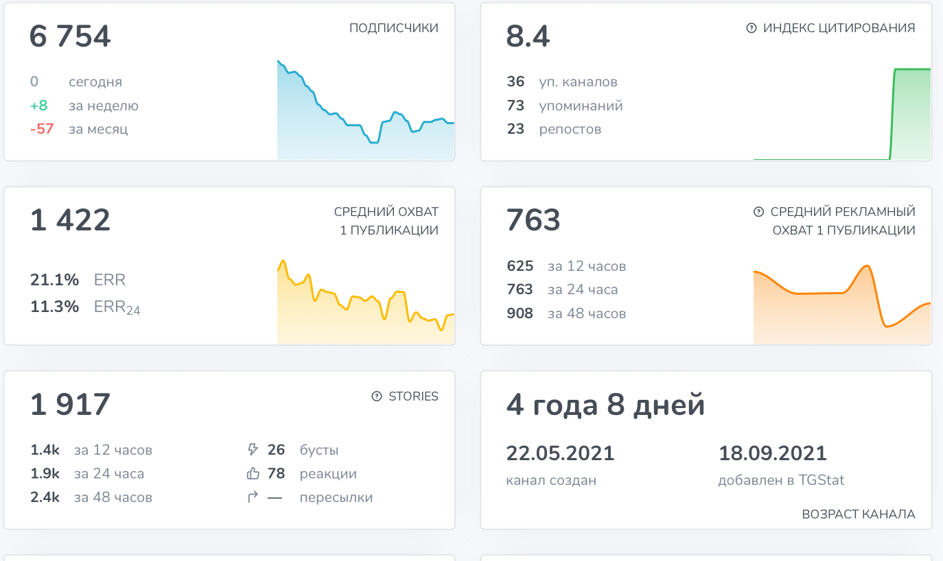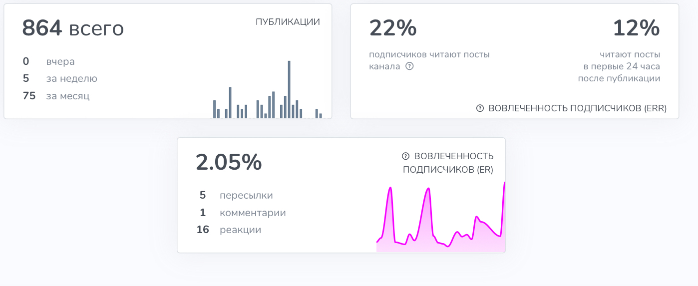 Мы проверили метрику канала через TGStat. Выяснилось, что у сообщества отрицательная динамика роста аудитории: за последний месяц отписалось 57 человек. Средний охват одного поста — 1422, что составляет 22% от всех фолловеров. Вовлеченность подписчиков — 2,05%. Эти показатели считаются низкими, что часто сигнализирует о накрутке.