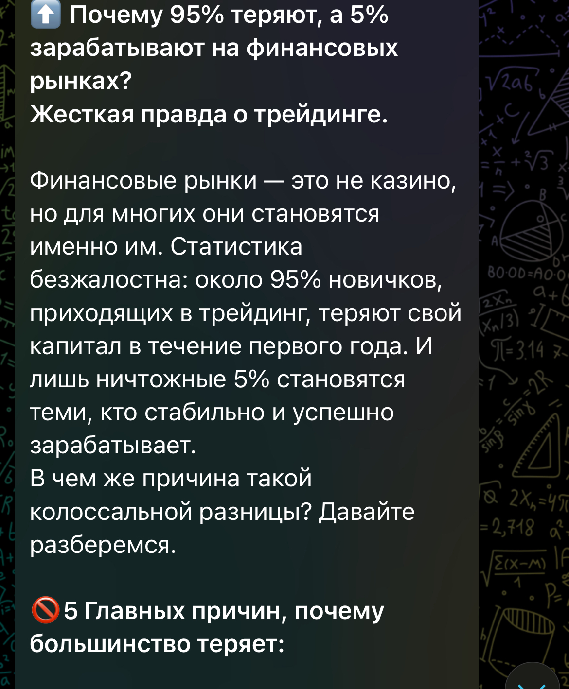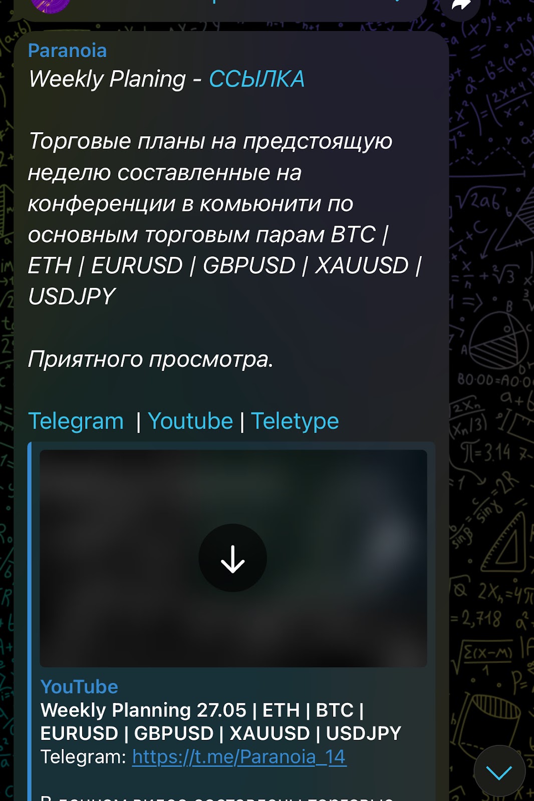 Можно найти сообщения о развенчании мифов трейдинга. Так, инвестор объясняет, почему из всех учась ноев рынка в плюс выходит только 5%. Есть посты, направляющие трафик в Ютуб-канал эксперта. Там он записывает платные на новую сессию.Платные услуги «Паранойя» в Телеге