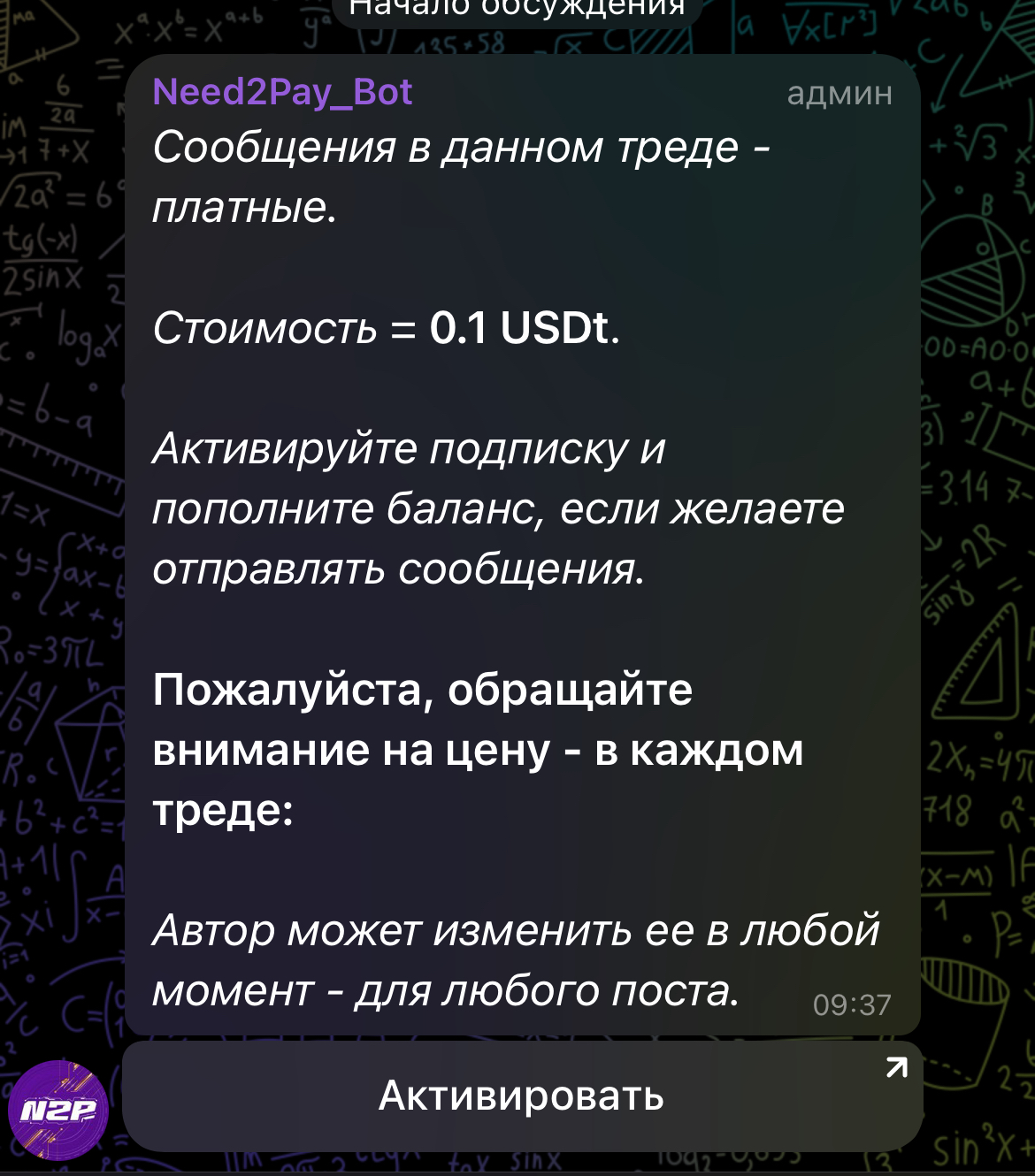 Оплата происходит через бота Need2pay. Он же позволяет создать платный доступ к комментариям под постами. Это и является вторым способом монетизации канала трейдера. Чтобы получить возможность писать под записями, нужно заплатить 0,1 USDT.