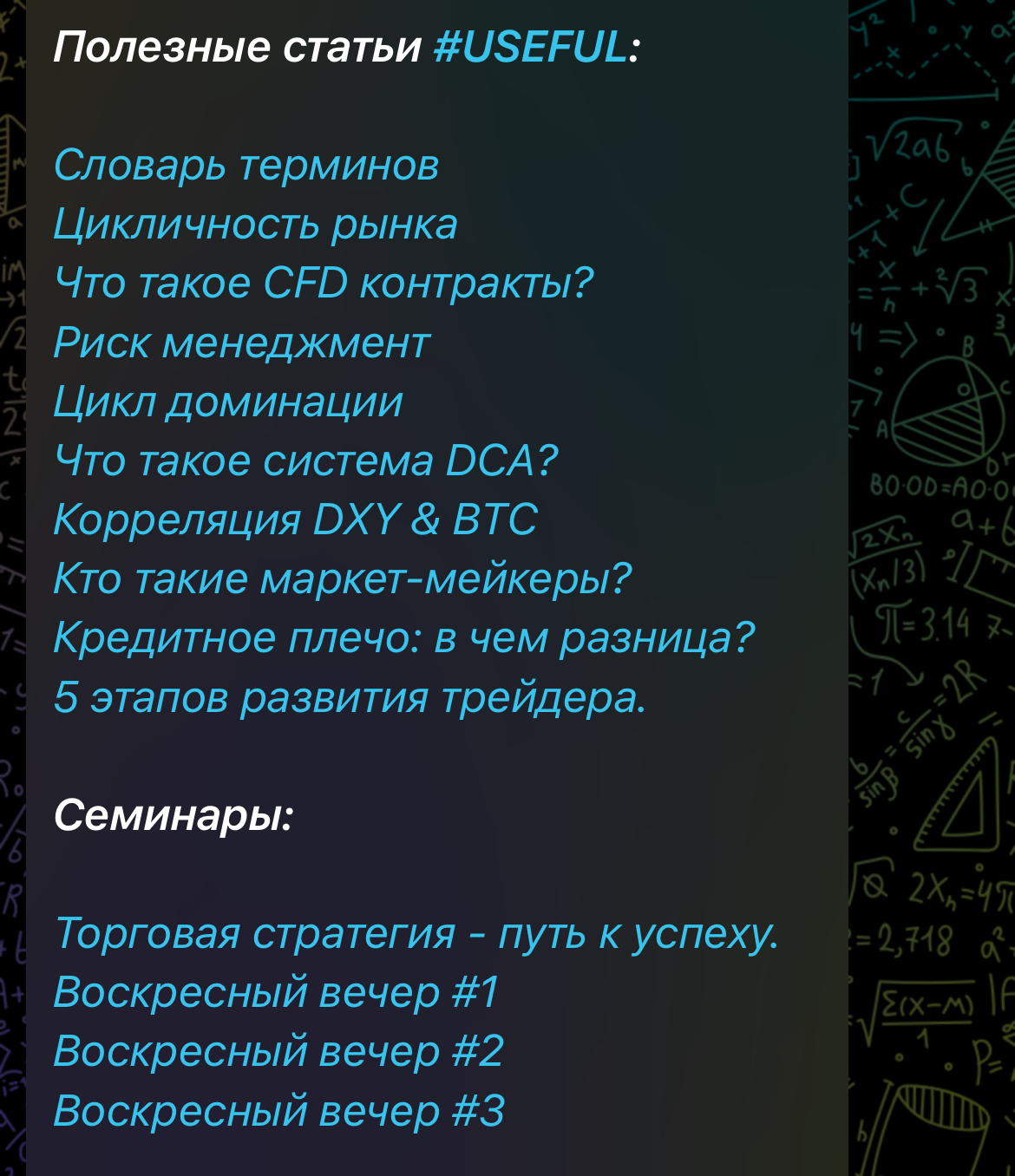 Среди постов на канале есть список полезных статей. В сообщении отмечены ссылки на обучающие записи, посвященные терминологии и работе рынка. Наличие бесплатных справочных материалов может привлечь новичков в трейдинге и улучшить авторитет инвестора.