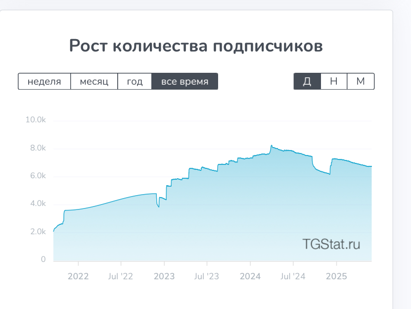 Мы детально изучили статистику подписчиков. Канал появился в 2021 году, но первая запись доступна только от 24 года. Вероятно, паблик был куплен вместе с аудиторией. При этом после перехода сообщества к трейдеру рост фолловеров стал прерывистым: плавное уменьшение и резкий скачок. Это может указывать о накрученных пользователях.