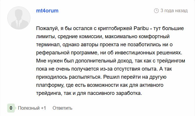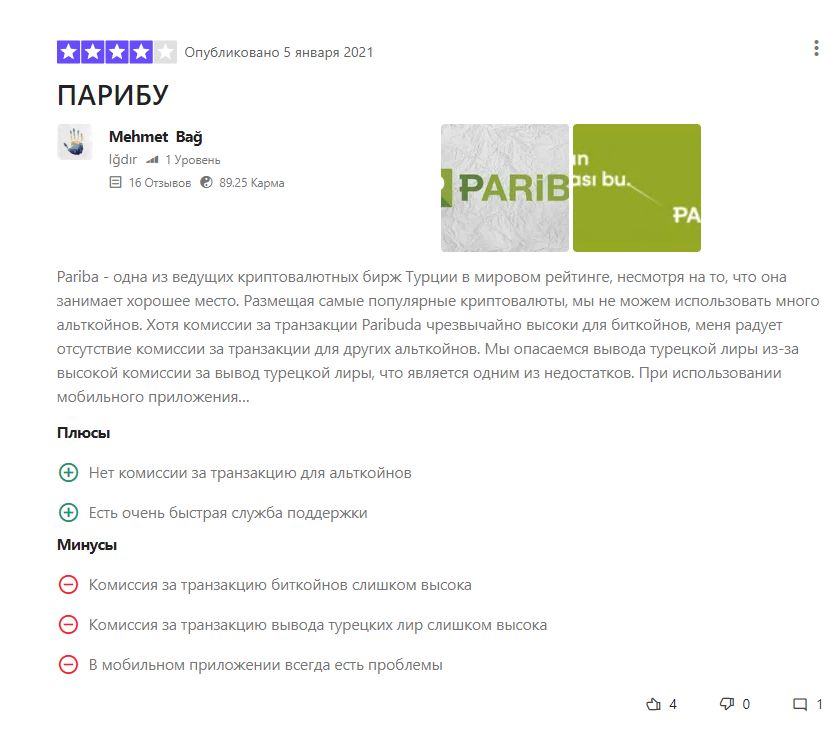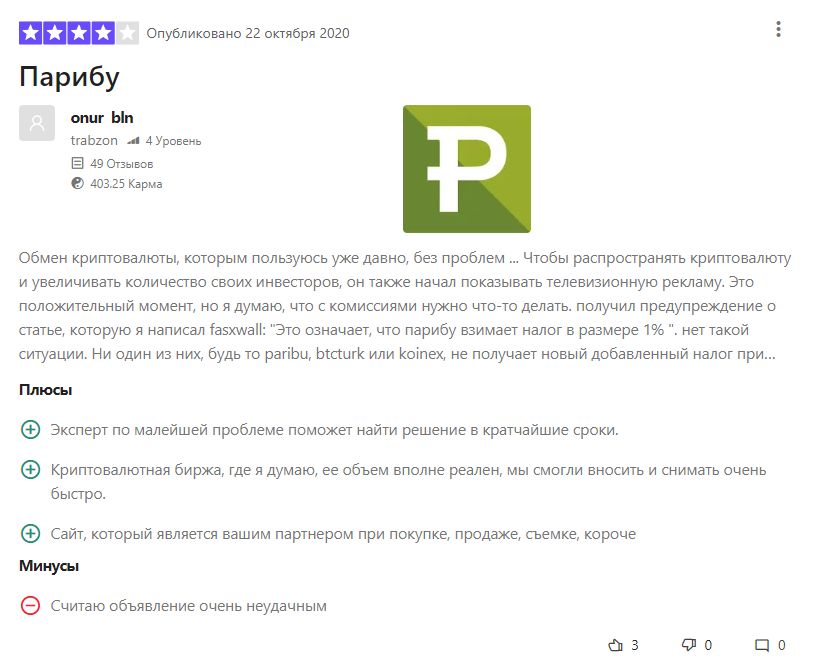 Отзывы о бирже «Парибу» в основном положительные. Из главных плюсов люди выделяют удобную торговлю биткоинами и турецкой лирой (TRY), а также безопасность и возможность внебиржевого обмена.