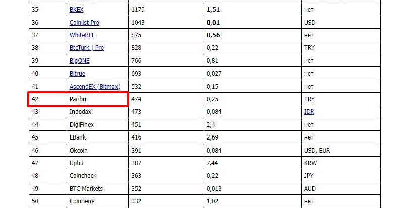 Paribu предоставляет собой веб-терминал для торговли криптовалютами, в особенности турецкой лирой (TRY), а также обмена биткойнов. В распоряжении трейдера личная команда экспертов и криптокошелек с повышенной системой защиты от хакерских атак. Благодаря этим инструментам биржа заняла 42-е место в ТОПе.
