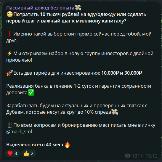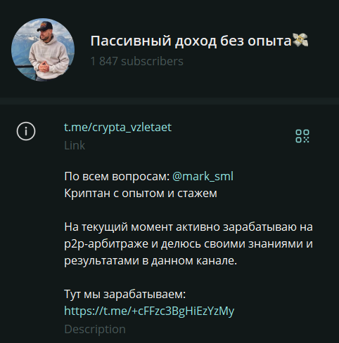 Телеграмм-канал Пассивный доход без опыта предлагает сигналы для P2P-арбитражной торговли криптой. Автор этого канала уверяет, что по его стратегии можно выйти на высокую прибыль даже с небольшим депозитом. Однако его утверждения сложно назвать убедительными по ряду причин:
