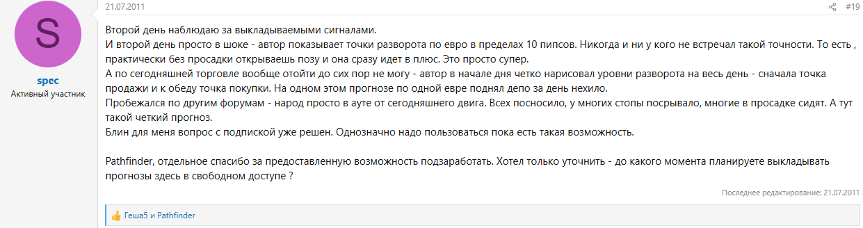На одном из форумов аноним в 2011 году регулярно публиковал прогнозы и результаты трейдинга через «Пазфайндер». Пользователи, а также студенты и выпускники онлайн-школ интересовались проходимостью сигналов, нюансами настройки системы.Оценить эффективность торгового ПО на конец февраля 2026 года довольно сложно. Есть вероятность, что трейдинг через Pathfinder действительно мог приносить прибыль, но о стабильности говорить не приходилось.