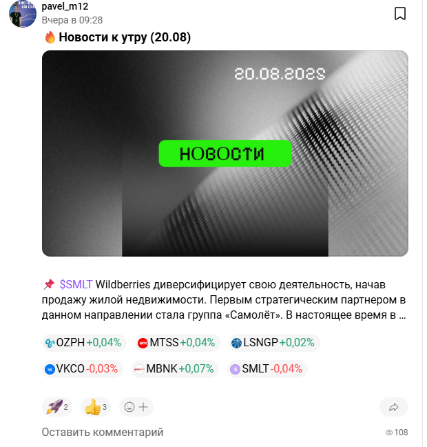 Большая часть публикаций представляет собой ежедневный утренний дайджест новостей из финансового мира. Подобные новости размещаются в любых тематических медиа, поэтому чего-то уникального Pavel M 12 не предлагает.
