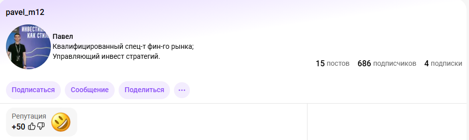 Вот только и аналитики здесь практически нет. За все время был выпущен всего один обзор рынка, но стоит отметить, что довольно подробный. Автор приводит в посте аргументы, однако сами прогнозы все же можно оценить только через некоторое время.Уже на другой платформе Павел М12 продвигает свою стратегию “Формула пассивного дохода”, которая должна принести 22% годовых. Однако это опять же расчеты самого трейдера, которые могут и не сбыться.