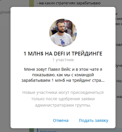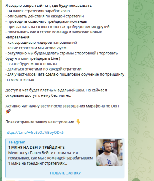 Актуальных платных продуктов от трейдера в блоге мы не нашли. Но скоро он начнет продавать доступ в свой закрытый чат «1 МЛН НА DEFI И ТРЕЙДИНГЕ». На сегодняшний день вход в него якобы бесплатный.