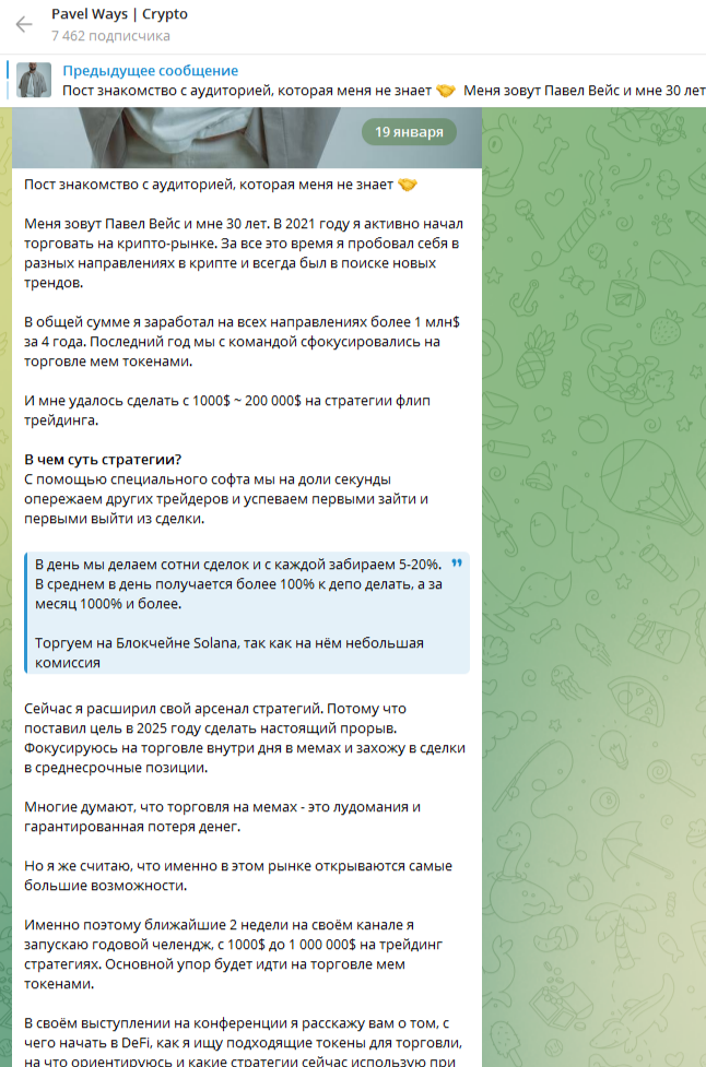 В 2021 году он стал публиковать профессиональный контент, связанный с торговлей, криптовалютой и инвестициями. Вот только вступительного сообщения Павел писать не стал. Приветственное сообщение трейдер выпустил лишь в январе 2025 года. То есть почти 4 года блогер придерживался анонимности, что очень странно.