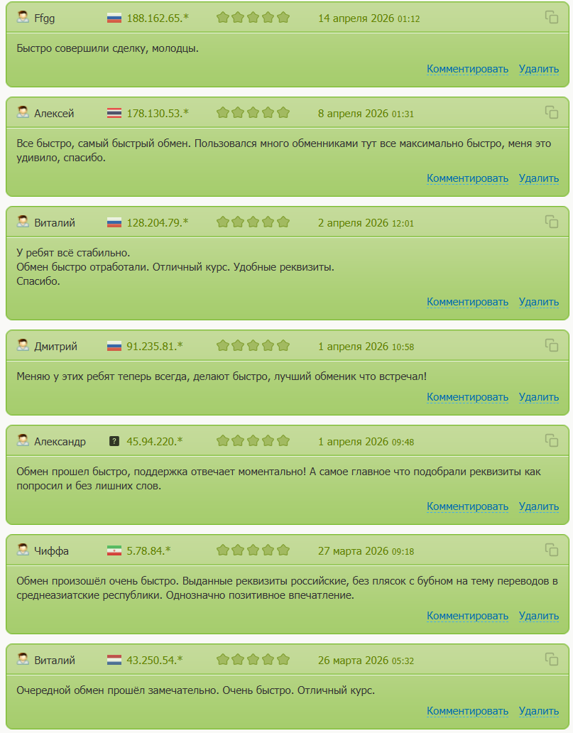Мы изучили комментарии пользователей, которые те оставили на портале BestChange. Все они положительные. Люди хвалят сервис за скорость и справедливый курс, некоторые отмечают качественную работу саппорта.