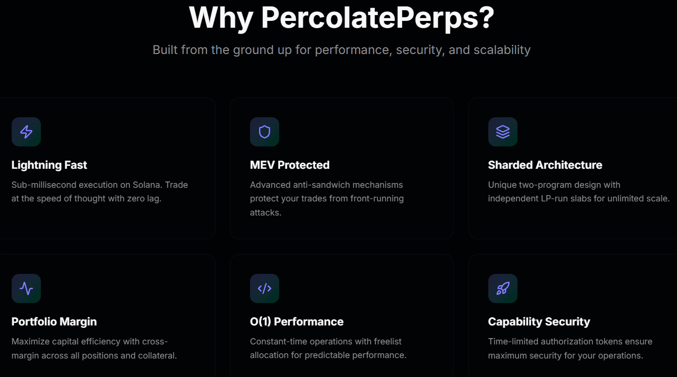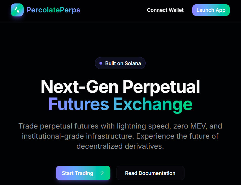 Проект Percolate Perps запустили 20 октября 2025 года. Его создатели неизвестны, о том, как работает биржа, почти нет подробностей. Она преподносится как “будущее трейдинга” и возможность торговать фьючерсами с минимальными комиссиями за счет работы на базе сети Solana.