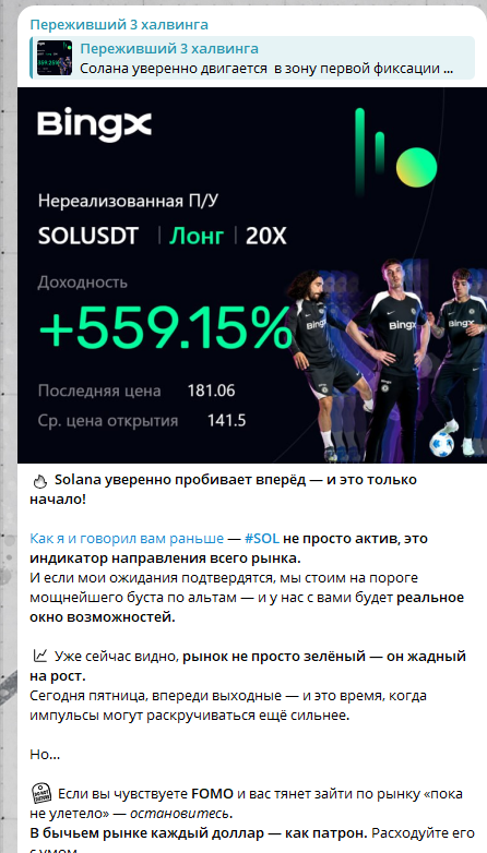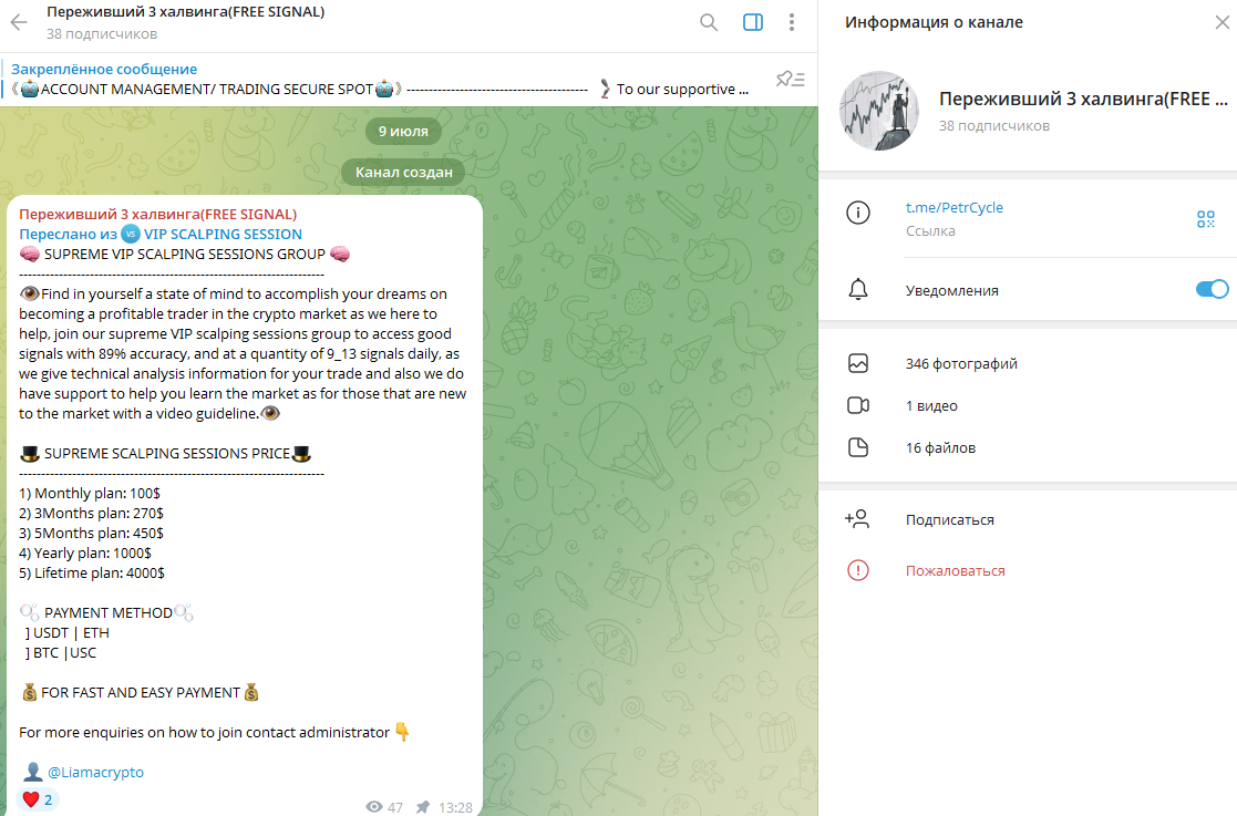 Канал был создан 9 июля 2025 года, через месяц после Halvings3. На нем публикуются предложения о вступлении в закрытое сообщество с сигналами на платной основе.