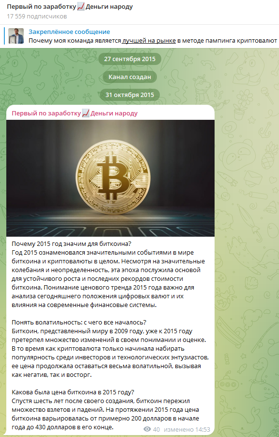 «Первый по заработку Деньги народу» – это телеграмм-канал про инвестиции и простые способы заработка, если верить администрации проекта. В рамках блога некий Михаил предлагает подписчикам легко получить деньги, без рисков и сложностей, что часто оказывается частью обманных схем.