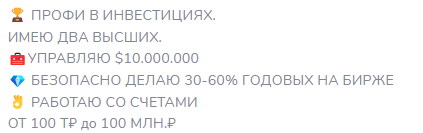 Петр Гулин – трейдер, управляющий сразу несколькими каналами в телеграм. Это Петр Гулин | Арбитраж на Мосбирже и Петр Гулин | Exponenta Invest. Помимо того, Петр ведет и аккаунт на YouTube и Вконтакте. Суммарная аудитория трейдера на всех площадках составляет примерно 20 тыс. человек. Трейдер утверждает, что является профессионалом в инвестициях. сам управляет суммой в 10.000.000$, Основным продаваемым проектом Петра Гулина является его закрытый клуб инвесторов. Набор в который он периодически открывает. Вступив в это сообщество, как утверждает автор, вы получаете очень много преимуществ. Тут и инсайд-сделки, и обучение работе с кошельками, и фарминг более 20% в USD. Однако непонятно, насколько эти обещания подкреплены реальными результатами. Необходимо понять, можно ли доверять проекту Петр Гулин арбитраж на мосбирже.