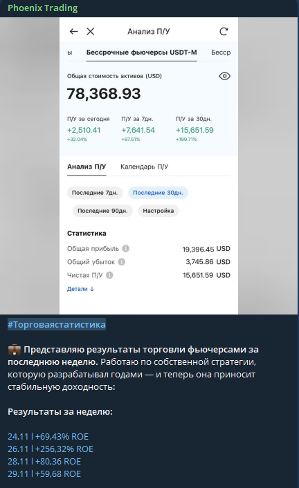 Еженедельно публикуются посты под хештегом #Торговаястатистика. Приводятся результаты торговли фьючерсами за неделю с ROE от 50% до 500% по отдельным сделкам. Автор пишет про собственную стратегию, разработанную годами. Суть системы нигде не раскрывается. Подтверждений от независимых источников нет.
