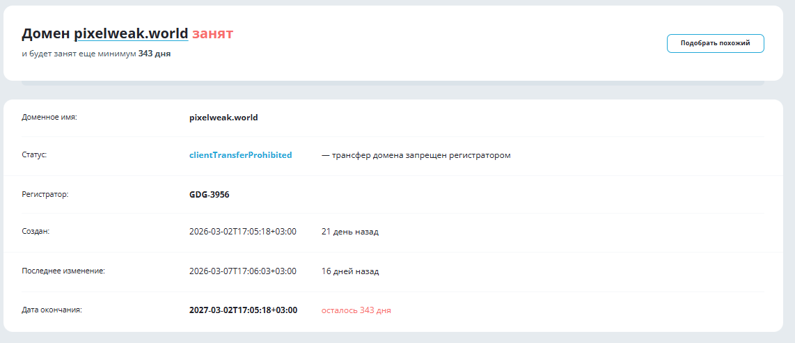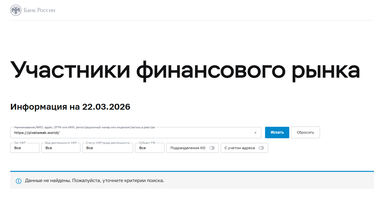 Еще один аргумент в пользу подозрения в мошенничестве, это дата регистрации домена, который появился только в марте 2026 года и используется на протяжении 21 дня. То есть PixelWeak world не назвать стабильной платформой с долгой историей, что подтверждается минимальным цифровым следом.